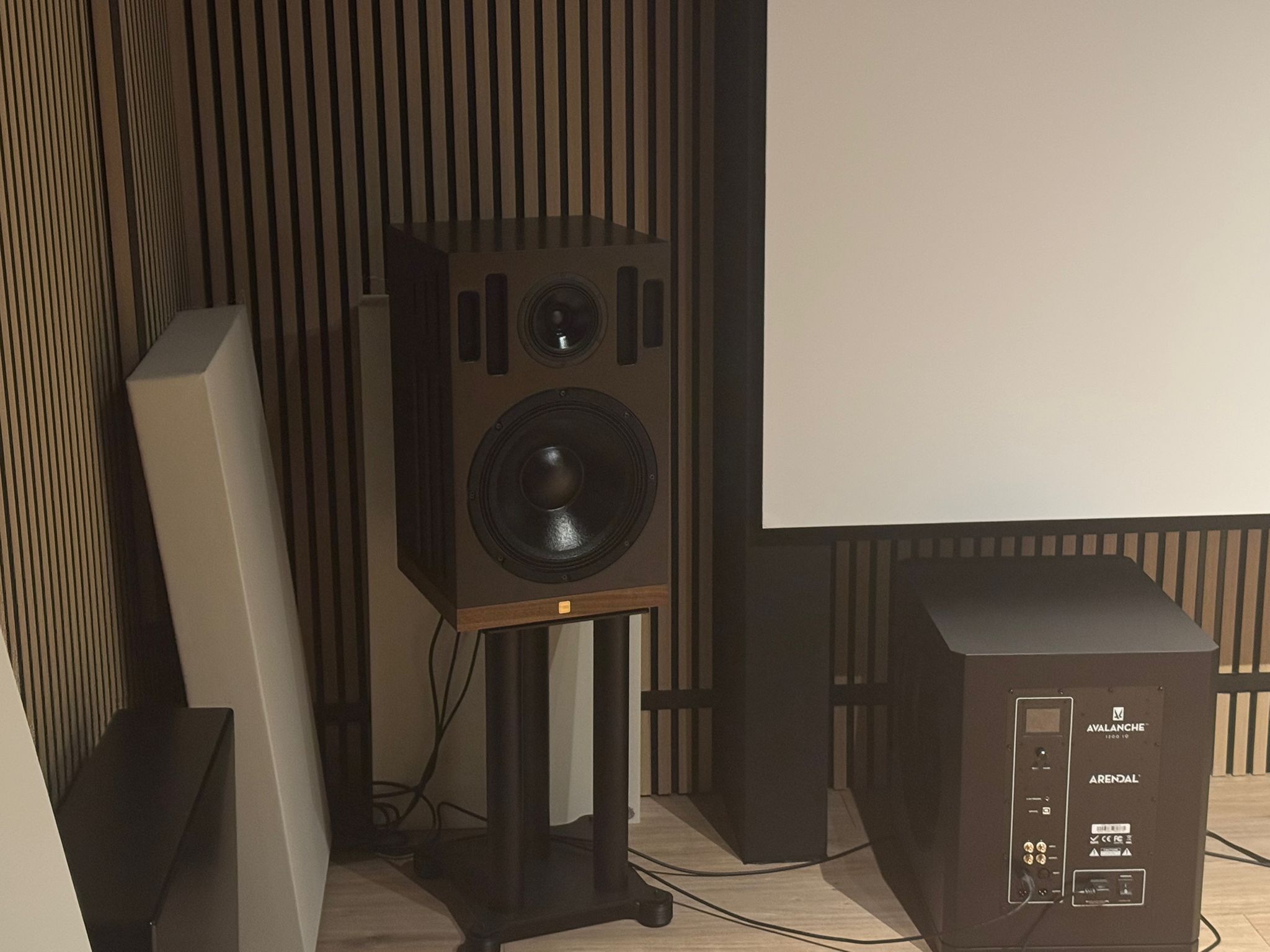 The system is installed in a dedicated, soundproofed room measuring approximately 4.7 × 4.3 meters, with a ceiling height of 2.6 meters. I also added some acoustic treatment: Absorbers, wooden slat panels with felt backing, and a rug on the floor.